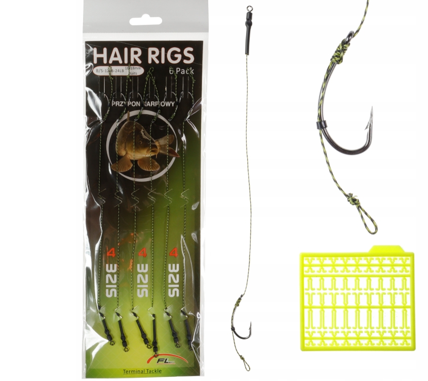 Zestaw 6 przyponów włosowych o długości ~21 cm. W skład zestawu wchodzą przypony z włosem o długości 16 - 18 mm. Dzięki zastosowaniu klasycznego haka karpiowego nie zachodzi potrzeba używania pozycjonera.